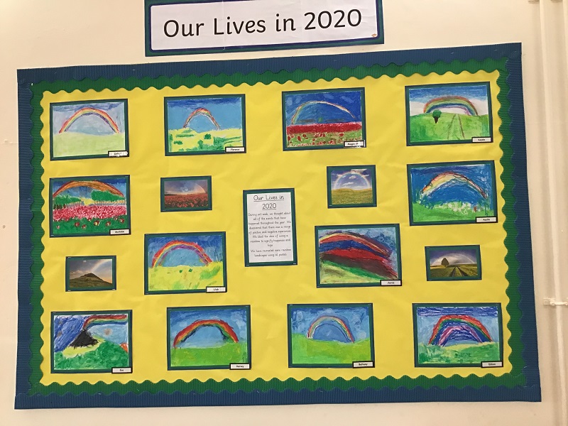 The whole school theme for Art Week this year was ‘Our Lives in 2020’. The children all came back to school excited to talk about what has happened over the year. KS1 noticed that rainbows had been seen everywhere and filled people with happiness and hope. Class 1 created rainbows using a range of different mediums. Class 2 recreated rainbow scenes using oil pastels.
