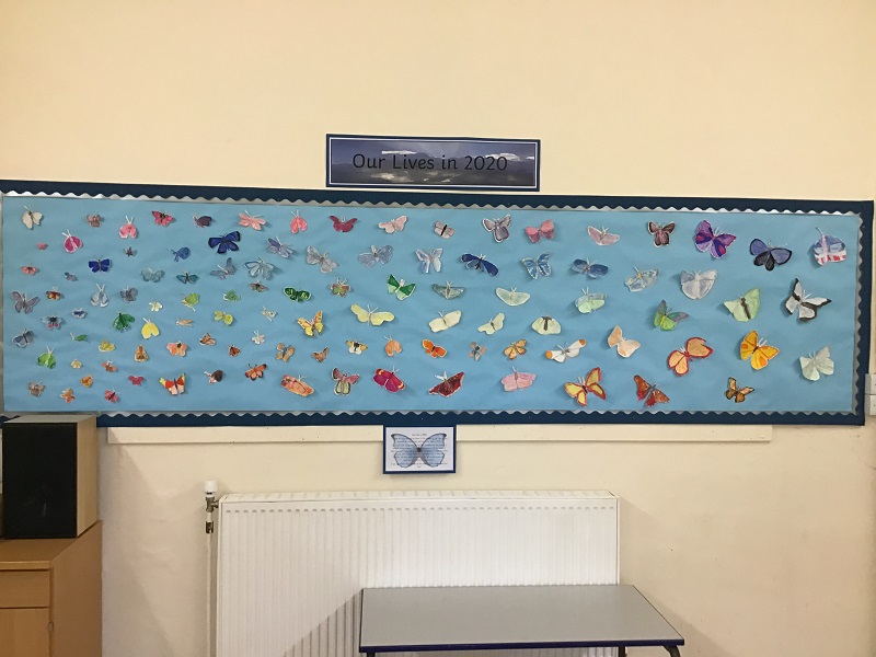 KS2 discussed the increased amount of wildlife that had been seen outside. Class 3 sketched some of the insects that they saw and coloured them using watercolour paints. Class 4 sketched and used watercolour to make many butterflies to create a butterfly rainbow.