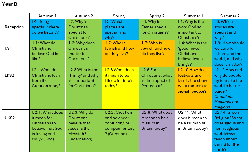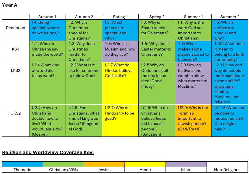 RE is a core, academic subject and is taught weekly by all classes. All statutory requirements are met. It follows the same principles as learning in all of our subjects. We follow the Herefordshire Agreed Syllabus, use Understanding Christianity and plans are developed based upon this. Planning is carefully thought out and is linked to key vocabulary. Progression across each year and between year groups is clear.